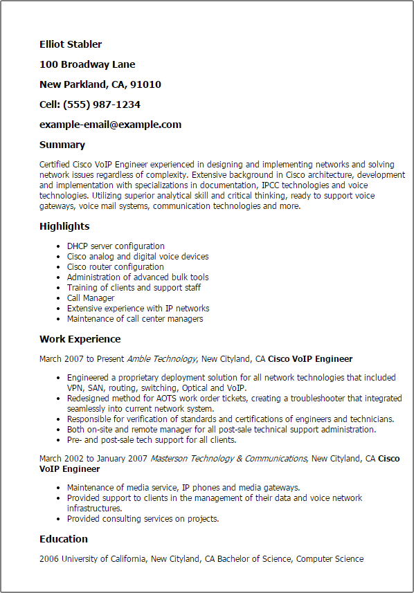 Our Cisco VoIP engineer resume sample demonstrates effective use of the conventional. Automatic Resumes in Just a Few Clicks. Get Hired 2x Faster w Americas Top Resume Templates.